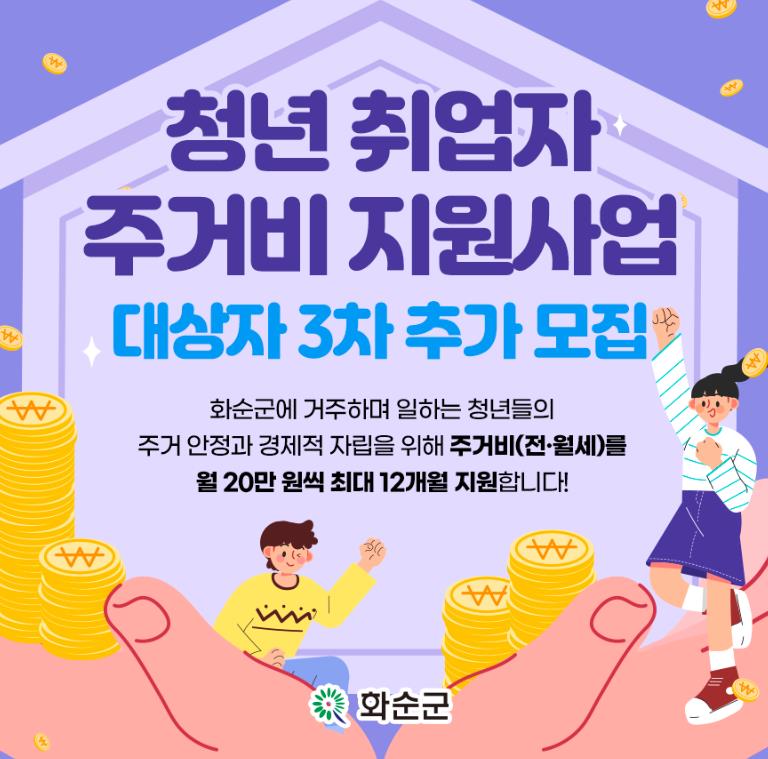 ‘청년 취업자 주거비 지원사업’은 화순군에 거주하는 일하는 청년들에게 주거비(전·월세)를 월 20만 원씩 최대 12개월간 지원하여 청년들의 경제적 부담을 덜어주고 화순에 안정적으로 정착할 수 있도록 돕기 위해 추진 중인 사업이다.