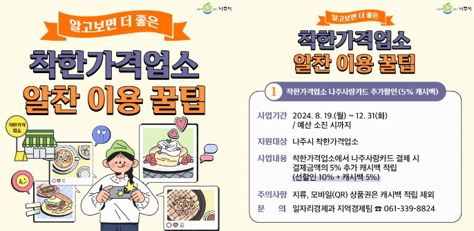 나주시는 19일부터 올 연말 예산 소진 시까지 ‘착한가격업소 나주사랑카드 추가할인(5% 캐시백) 지원사업’을 추진한다고 밝혔다.