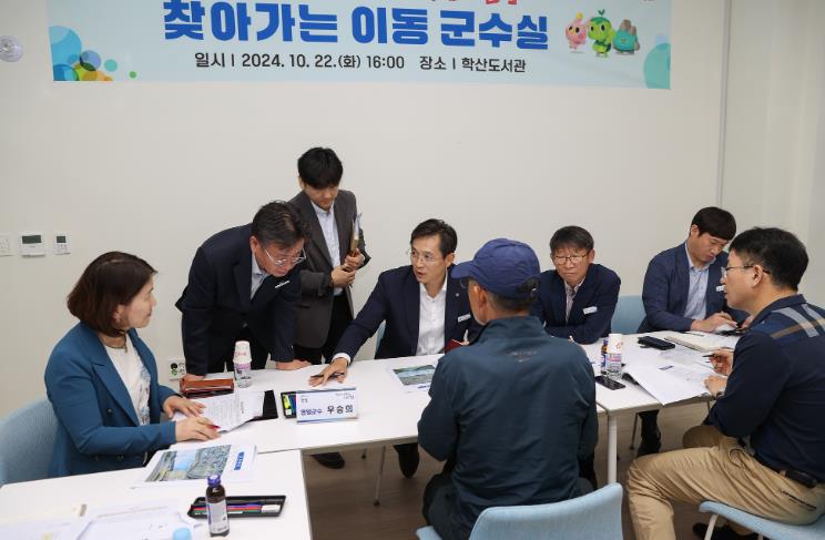 [뉴스전남] 우승희 영암군수가 22일 ‘찾아가는 이동 군수실’로 학산도서관을 찾아 ‘독천리 공용주차장 포장’ ‘학계리 진입로 가드 레일 설치’ 등 주민의견을 들었다.