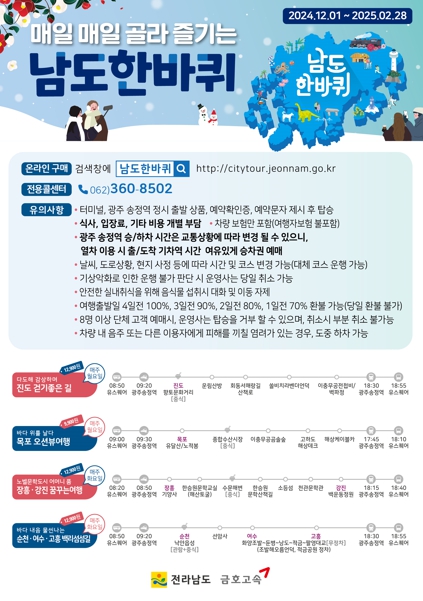 남도한바퀴는 전남을 찾는 관광객이 쉽고 편하게 도내 다양한 관광지를 즐기도록 광주 유스퀘어, KTX 광주송정역과 연계해 순환버스를 운영하고 있다.