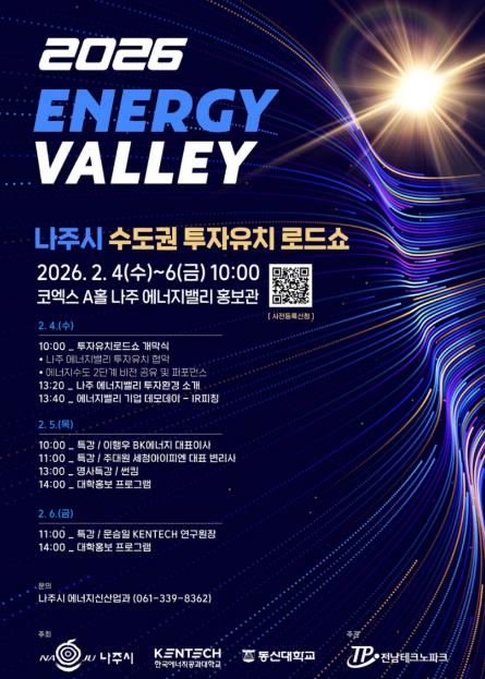 나주시는 오는 2월 4일부터 6일까지 3일간 서울 코엑스에서 ‘2026년 수도권 투자유치 로드쇼’를 열고 에너지 기업 유치 및 투자 활성화에 나선다고 29일 밝혔다.