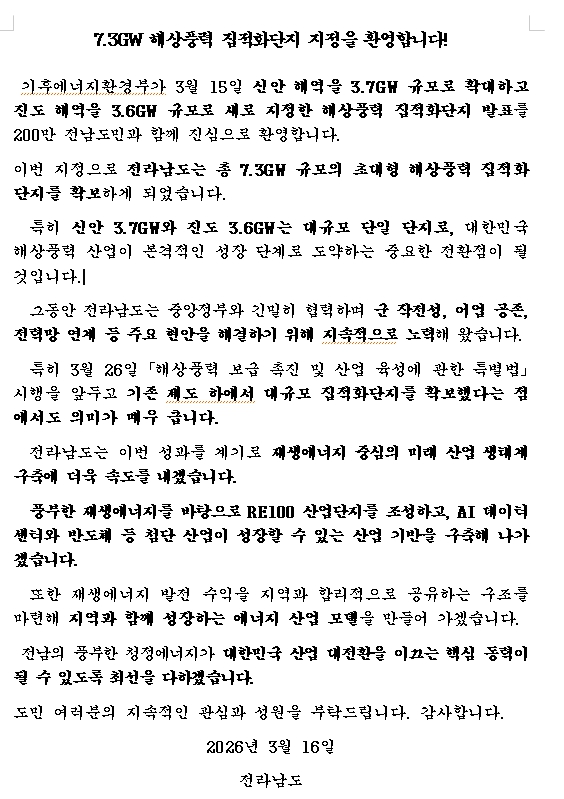- 신안·진도 7.3GW 초대형 집적화단지 지정 환영문 발표