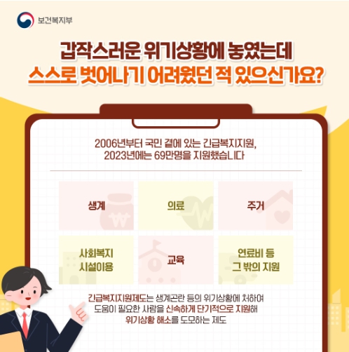 이같은 긴급복지지원은 4인 가구 기준으로 생계비는 183만 원, 주거비는 시 지역 43만 원, 군 지역 25만 원까지 지원한다. 의료비는 최대 300만 원을 지원하고, 그 외 부가급여로 연료비(10월~3월), 교육비, 해산·장제비 등도 지원한다.
